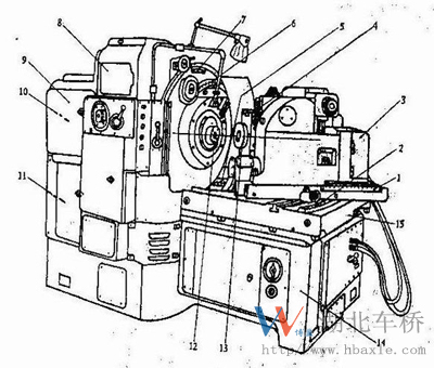 1、水平輪位 2、安裝角 3、分度掛輪 4、垂直輪位 5、床位 6、刀位 7、搖臺角 8、滾切修正機構 9、進給掛輪 10、切速掛輪 11、滾比掛輪 12、刀盤主軸 13、工件主軸 14、床身 15、床鞍