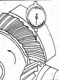 其測量方法是將百分表的觸頭,垂直的壓在大齒輪的大端齒面上,固定小齒輪,然后擺動大齒輪,百分表的指針擺動范圍即為齒輪的齒側(cè)間隙。