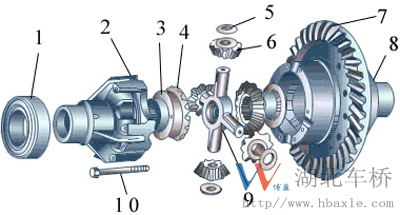 1-差速器殼軸承;2和8-差速器殼體;3和5-調整墊片;4-半軸齒輪(兩個);6-行星齒輪(兩個或四個); 7-主減速器從動錐齒輪;9-行星齒輪軸。