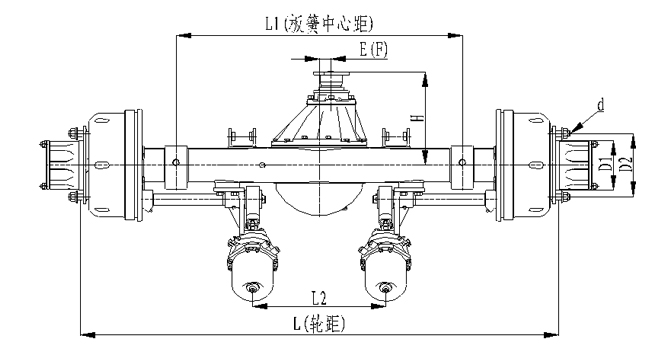 1.橋殼采取加強型設計,承載能力強;2.車輪輪輞定位方式可采用球面定位或止口定位;3.板簧距與輪距可以靈活調整